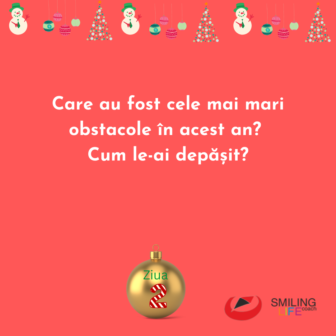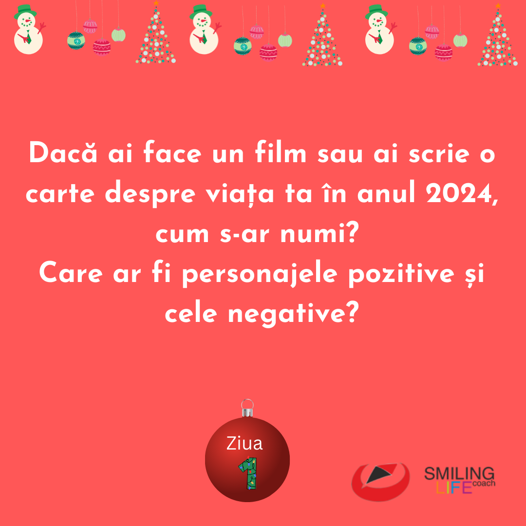 Articole de Life Coaching Ziua 2 – Smiling Life Coaching Advent Calendar (Pune stop pe una dintre cele trei întrebări/provocări și răspunde la ea:) Care au fost cele mai mari obstacole în acest an? Cum le-ai depășit? Ce obiectiv important pentru tine... Citește mai mult Ziua 1 – Smiling Life Coaching Advent Calendar Ziua 1 - Smiling Life Coaching Advent Calendar (Pune stop pe una dintre cele trei întrebări/provocări și răspunde la ea:) - Dacă ai face un film sau ai scrie o carte despre ... Citește mai mult Smiling Life Coaching Advent Calendar 2024-2025 Anul acesta vă propun un Smiling Life Coaching Advent Calendar cu un format mai jucăuș 😉: întrebările și sarcinile pe care le veți primi vor fi alese de voi din cele trei care a... Citește mai mult SMILING LIFE COACHING ADVENT CALENDAR 2023 Dragilor, Anul acesta am lucrat cu niște oameni minunați care și-au dorit să iasă din zona de confort, să fie mai încrezători în potențialul personal, să se bucure și să fie rec... Citește mai mult SMILING LIFE COACHING ADVENT CALENDAR Sunteți minunați și știți asta! 🤗 Dar cum a fost anul 2022 pentru voi? 🤔 Ca și anul trecut, vă provoc ca de azi, timp de 24 de zile, să vă îngăduiți zilnic cinci minute de rel... Citește mai mult « 1 … 3 4 5 6 7 8 9 10 11 12 13 14 »